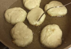 Na rozgrzany olej, za pomocą łyżki nakładaj ciasto, formując małe placki. Obsmaż z obu stron na złoty kolor.
