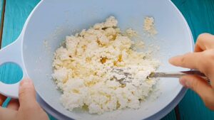 W misce połącz: twaróg, sól i miękkie, pokrojone wcześniej w kostkę masło. Składniki te rozgnieć widelcem do uzyskania gładkiej masy.