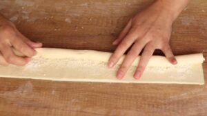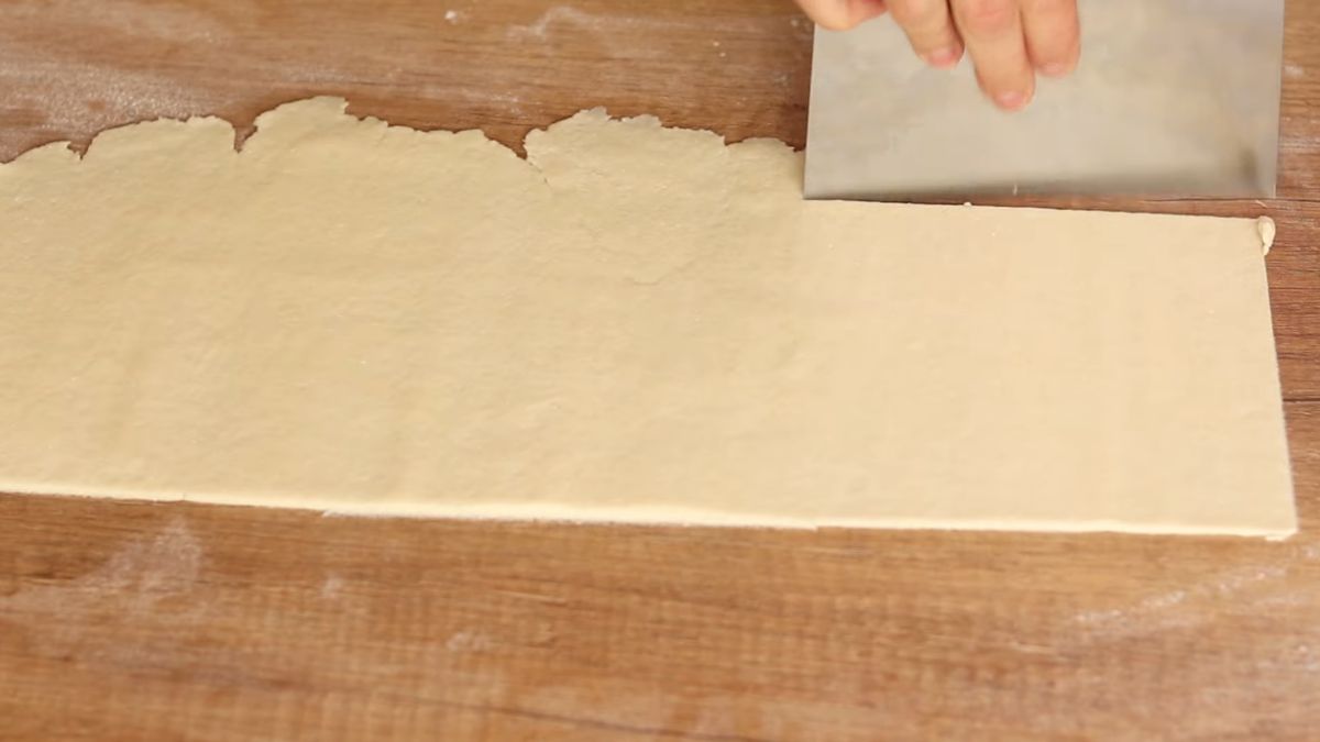 Podziel je na dwie części, każdą z nich rozwałkuj na około 2-3 cm. Poszarpane krawędzie odetnij tak, by kawałki ciasta wyglądały jak długie prostokąty.