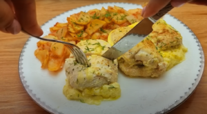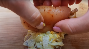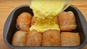 Powstałą masę rozłóż na kawałkach mięsa i zawiń w roladki. Przygotuj blaszkę do zapiekania, posmaruj tłuszczem i ułóż na niej roladki z kurczaka.