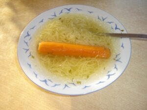 Po zagotowaniu wywaru zebrać szumowinę za pomocą sitka lub łyżki i zmniejszyć. Zmniejszyć temperaturę palnika, aby rosół lekko „pyrkał” i gotować pod przykryciem przez około 1,5 godziny. Kiedy bulion jest już gotowy, należy wyjąć kurczaka i opcjonalnie dodać trochę wody. Mięso dzielimy na małe kawałki i wrzucamy z powrotem do rosołu. Zupę podawać najlepiej z drobnym makaronem np. nitki.
