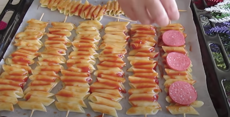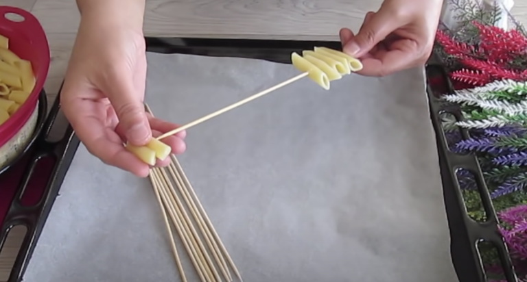 Przygotowany w ten sposób makaron należy odcedzić i dać mu ostygnąć. Następnie nadziewamy go na patyczki.
