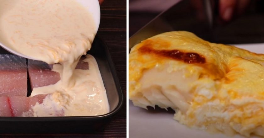 3. Rybę w naczyniu, zalej przygotowanym sosem i wygładź szpatułką na całej powierzchni.
