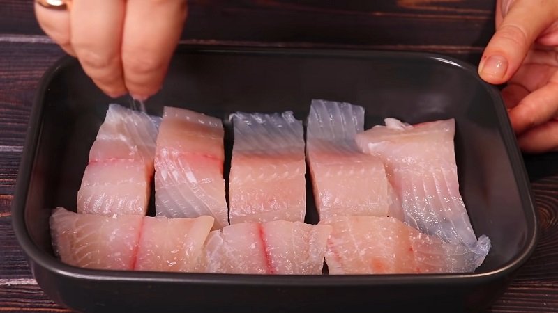 1. W naczyniu żaroodpornym, poukładaj pokrojonego na mniejsze kawałki fileta z ryby i posyp lekko solą.