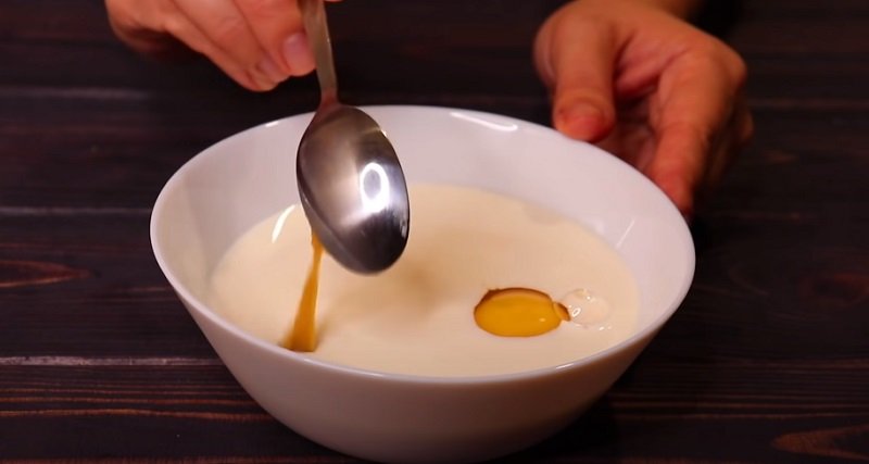 2. Teraz przygotuj kremowy sos: W misce, ubij jajka ze śmietana i musztardą. Następnie dodaj starty na tarce o drobnych oczkach ser i wymieszaj.