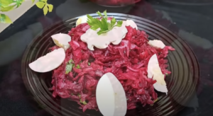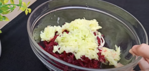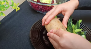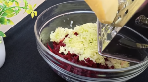Ogórki obierz, zetrzyj i odciśnij z nich nadmiar soku. Dodaj do startych buraków. Dodaj również ugotowane i starte ziemniaki.