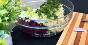 Dodaj posiekaną czerwoną cebulę i drobno posiekaną natkę pietruszki. Dopraw solą i pieprzem.