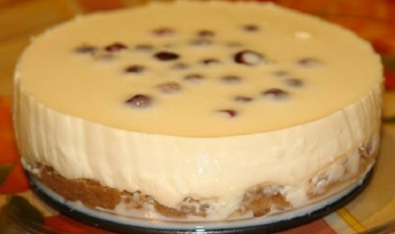 5. Otrzymaną masę wlej do formy, w której są już ciastka. Na około 2-3 godziny odstaw do lodówki, aby ciasto otrzymało właściwą konsystencje.