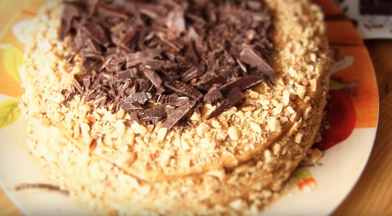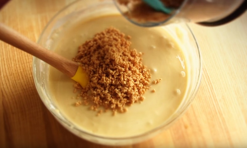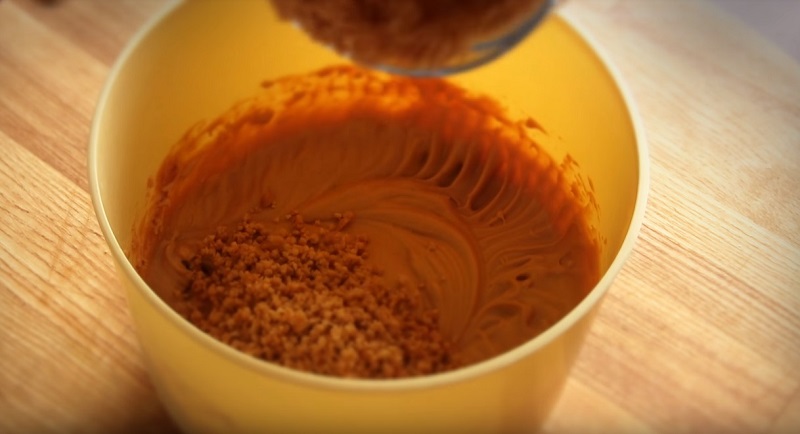 5. Teraz czas na krem: Do wysokiego naczynia wlej mleko skondensowane, dodaj miękkie masło i z pomocą miksera ubijaj do czasu, aż zgęstnieje. Potem, dodaj pozostałe orzechy, wymieszaj i wstaw do lodówki na 10 minut.