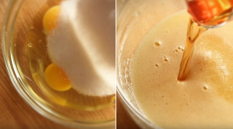 1. Jajka, ubij mikserem na wysokich obrotach z cukrem, a następnie dodaj cukier waniliowy, koniak i miód. Dokładnie wymieszaj.