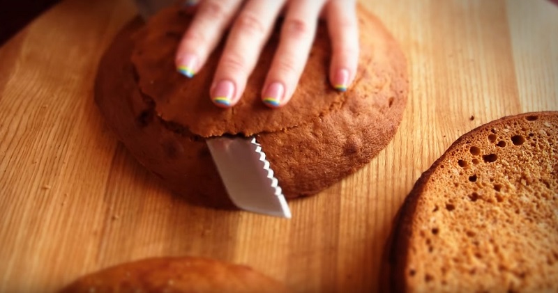 4. Przygotowane ciasto, podziej na dwie części i każde z nich piecz w piekarniku, rozgrzanym do 180° C do czasu, aż się pięknie zarumieni. Gotowość sprawdzaj drewnianym patyczkiem. Gotowe ciasto, wyjmij z piekarnika i pozwól wystygnąć. Potem, przekrój każde ciasto na pół.