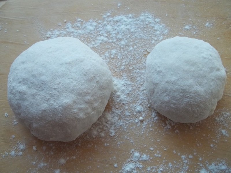1.Do miski wsyp mąkę, cukier, łyżeczkę soli oraz wlej wodę i olej. Dokładnie ugnieć na gładkie, jednolite ciasto, następnie podziel na dwa kawałki jeden większy , a drugi mniejszy. Z otrzymanych kawałków uformuj kulki , następnie przykryj oraz odstaw na bok na około 20 minut.