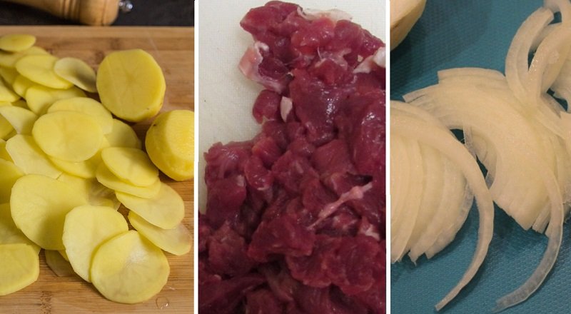 2.Teraz masz czas na przygotowanie nadzienia: w plastry pokrój obrane ziemniaki, na cienkie piórka pokrój cebulę, a w maszynce zmiel mięso. Do miski z mięsem dodaj łyżeczkę soli oraz pieprz, wszystko dokładnie wymieszaj.