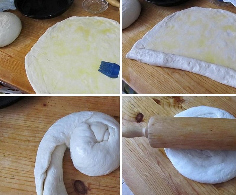 3 .Rozwałkuj oba ciasta na cienko, następnie obficie posmaruj roztopionym masłem. Ciasto ponownie zwiń w kulkę, na bok odłóż na chwilę , taką czynność powtórz dwa razy.
