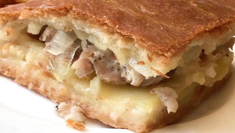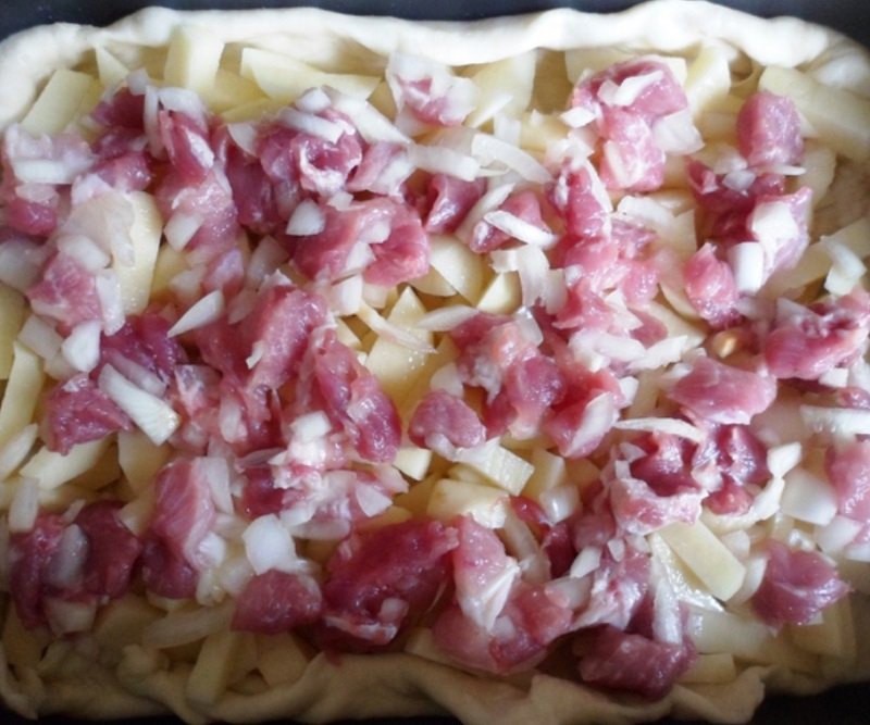 4.Wysmaruj tłuszczem blachę, przełóż na nią rozwałkowane większe ciasto, następnie ułóż na nim ziemniaki, mięso oraz cebulę. Połóż na to rozwałkowane mniejsze ciasto , brzegi dokładnie sklej i wierzch wysmaruj masłem . Na czubku za pomocą noża zrób małe nacięcie.