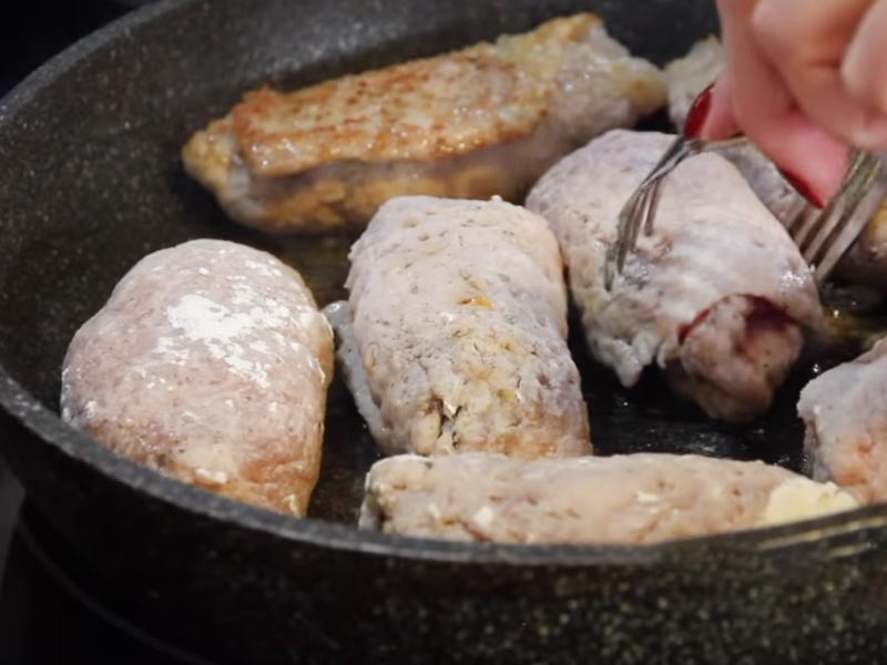 2.Zamarynowaną cebulę połóż na mięso, następnie zwiń je w roladki. Przygotowane mięso obtocz w mące i na złoty kolor smaż.
