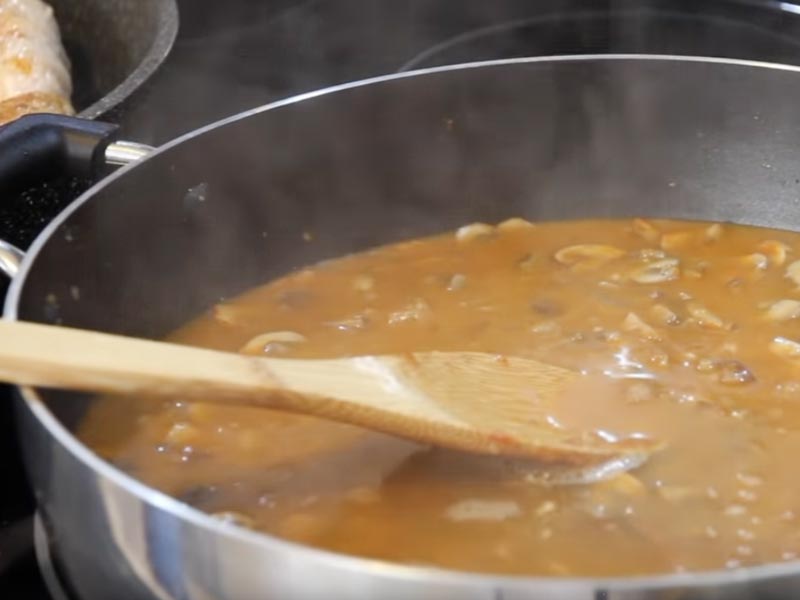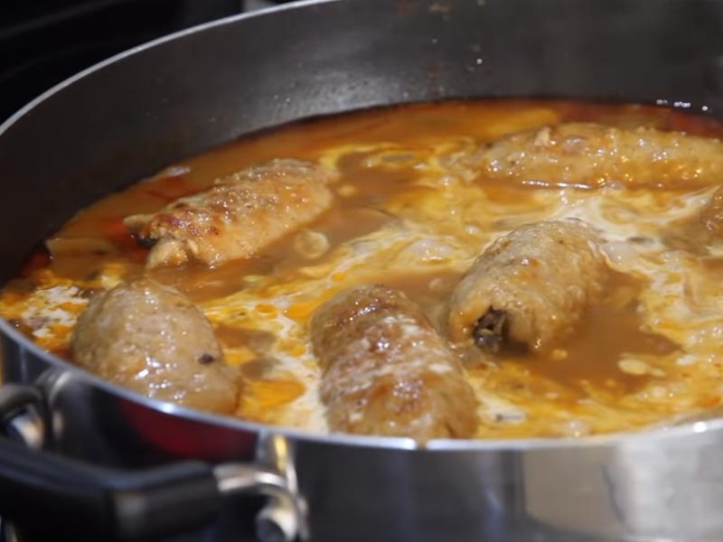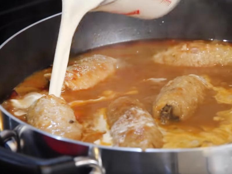 4.Roladki włóż do przygotowanego sosu, tak aby przykryte były całe. Gdy tak nie jest to dodaj więcej wody. Duś przez 40 minut na małym ogniu. Po upływie tego czasu możesz cieszyć się pysznym daniem.