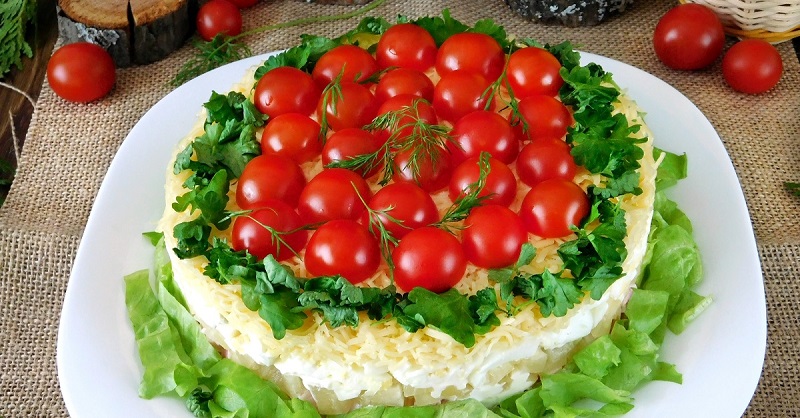 Przed podaniem, udekoruj sałatkę według uznania. Najlepiej prezentuje się z pomidorkami koktajlowymi, oliwkami lub winogronem. Wesołych Świąt!