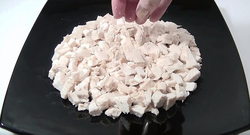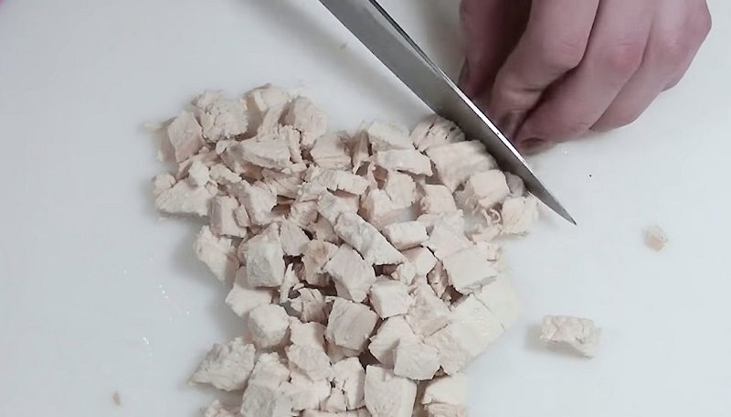 1. Ugotowanego w lekko osolonej wodzie fileta z kurczaka wystudź i pokrój w kosteczkę.