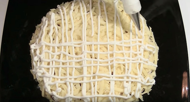 6. Na koniec warstwa jajek i warstwa majonezu. Całość lekko dociśnij, wygładź i posyp startym serem. Gotowe!