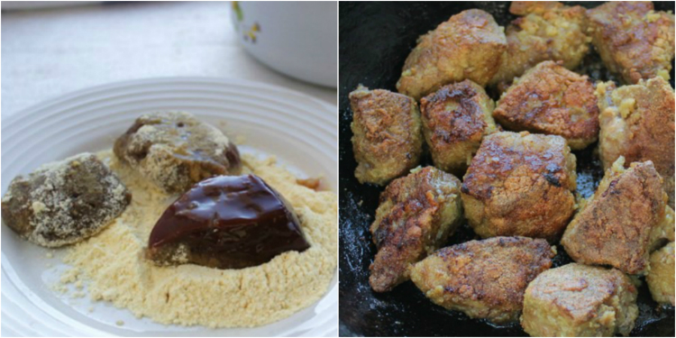 4. Zamarynowane kawałki wątróbki obtaczaj w mące, następnie smaż na rozgrzanej oliwie. Trochę masła dodaj do smaku. Smaż z każdej strony przez 3 minuty .