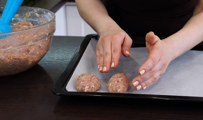7.Obok siebie na blaszkę poukładaj uformowane kotleciki. Gdy namoczysz dłonie , łatwiej będzie się formować kotleciki.