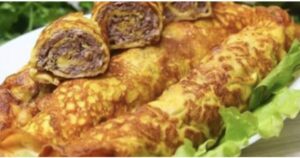 Całość zmiksuj porządnie blenderem. Na rozgrzaną patelnię z odrobiną tłuszczu, smaż naleśniki, przygotowane ciasto powinno wystarczyć na 5 sztuk naleśników. jedna strona naleśnika powinna pozostać niesmażona, nałóż na jej powierzchnię mięso i zawiń.