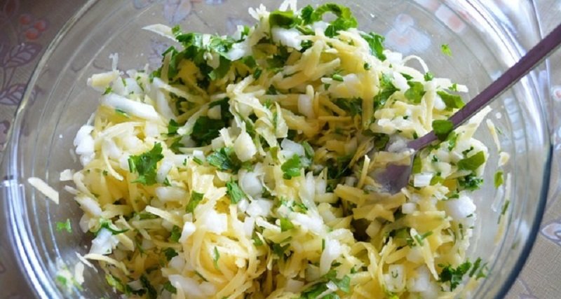Przygotowujemy dwa naczynia-miski. Do jednej wkładamy posiekaną pietruszkę i cebulę. Dodajemy też ziemniaki, wcześniej obrane i starte na grubej tarce. Wszystko należy dokładnie wymieszać.