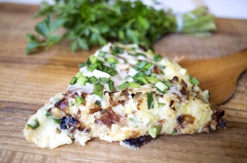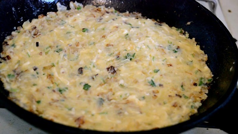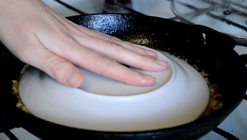 Na rozgrzaną patelnię wlewamy masę ziemniaczaną, wygładzamy ją, przykrywamy i smażymy na niewielkim ogniu. Trzeba usmażyć najpierw jedną a później drugą stronę, każdą przez 15 minut.