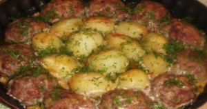 Poukładaj mięsne kulki na zewnętrznej stronie, wysmarowanej tłuszczem formie. W środku natomiast, poukładaj obrane i ugotowane wcześniej na półtwardo ziemniaki. Piecz w piekarniku, rozgrzanym do 220 stopni C, przez 15 minut.