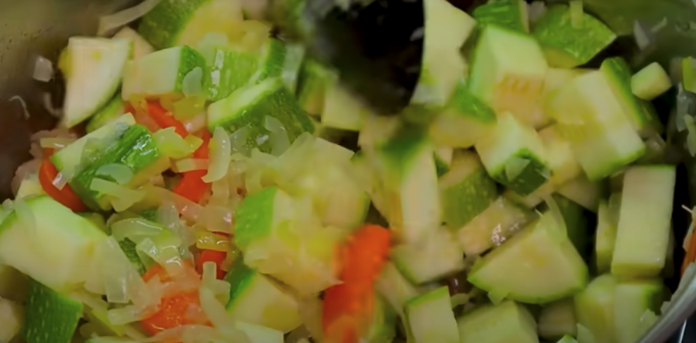 Posiekaj 2 cebule. Na patelni rozgrzej olej słonecznikowy i podsmaż cebulę na średnim ogniu, aż stanie się miękka i lekko złocista. Dodaj pokrojony por i 2 posiekane ząbki czosnku, smaż przez kilka minut. Dodaj pokrojoną w kostkę marchewkę i kontynuuj smażenie, aż warzywa będą miękkie. Pokrój 3 cukinie w kostkę i dodaj do garnka. Zalej warzywa wodą, tak aby były przykryte, przykryj pokrywką i gotuj przez 15 minut.