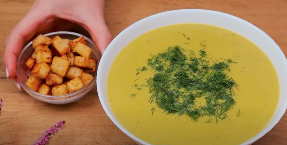 Piecz w nagrzanym piekarniku, aż grzanki będą złociste. Gdy warzywa są miękkie, zmiksuj zupę blenderem na gładką masę. Posiekaj koperek i dodaj do zupy. Podawaj zupę jarzynową gorącą z chrupiącymi grzankami na wierzchu.